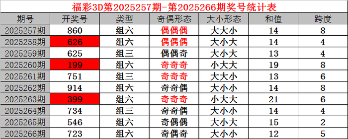 上期回来:福利彩票3D第2025266期开奖服从723。奖号:奇偶奇、大小小,和值12,跨度5。
