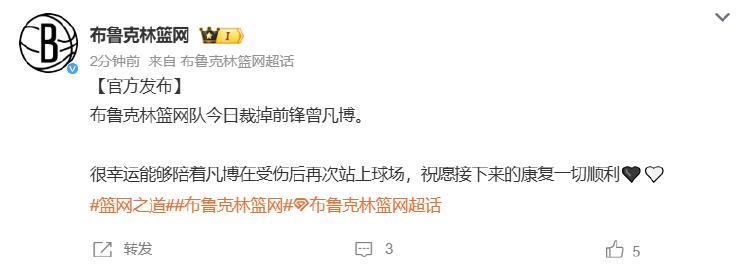 10月15日,据布鲁克林篮网官方微博音信:布鲁克林篮网队当天裁掉先锋曾凡博。