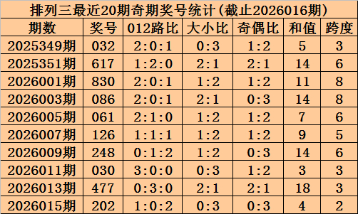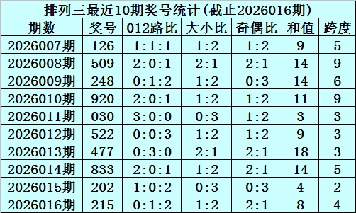 上期回来:罗列三2026016期奖号为215,奇偶比为2:1,大小比为1:2,跨度为8。