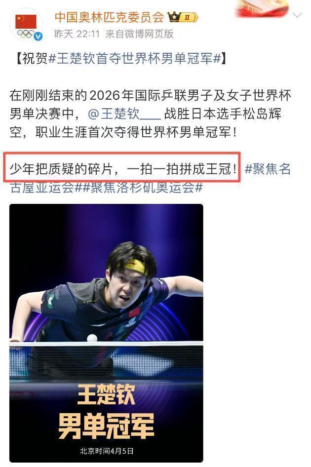 谁也莫得猜测,夺冠只是24小时后,中国奥委会便发布了一条官方评价,莫得丽都的辞藻,莫得冗长的陈诉,只消短短16个字:"少年把质疑的碎屑,一拍一拍拼成皇冠"。这16个字如澌灭颗插足湖面的石子,在体育圈激起层层飘荡,连忙登上热搜,让多半球迷动容。它不仅是对王楚钦夺冠的祝愿,更是对他十年办事生存最精确的注脚,谈尽了这位年青选手从质疑声中走来的艰辛与荣耀,也激励了东谈主们对体育精神、成长价值的深层想考。