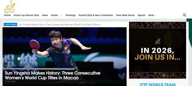 上周末进行的澳门宇宙杯2026女单决赛,赛会前两号种子孙颖莎和王曼昱迎来了巅峰对决,最终孙颖莎以4比1的总比分奏凯,夺得冠军。值得一提的是,莎莎奏凯卫冕的同期还成为历史上首位获取女子单打宇宙杯三连冠的通顺员!赛后,ITTF国外乒联发布长文赞誉孙颖莎创造历史,而这篇著述被发布在国外乒联官网首页最显贵的位置上。